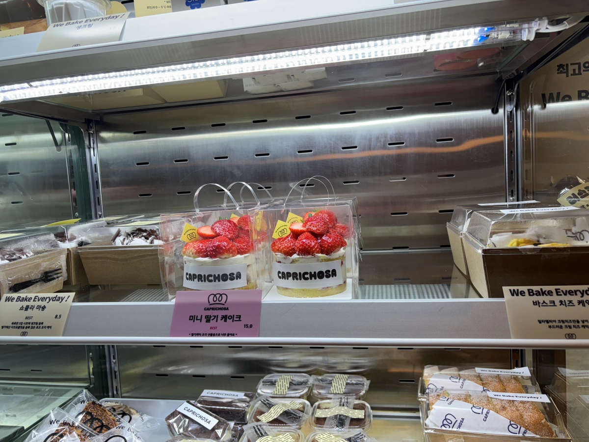 홀케이크 종류도 많아요. 그리고 냉장고에 싱싱한 딸기가 보이네요. 먹어보지 않았지만 신선한 딸기를 사용하니 당연히 케이크는 맛있을 수밖에 없겠지요.