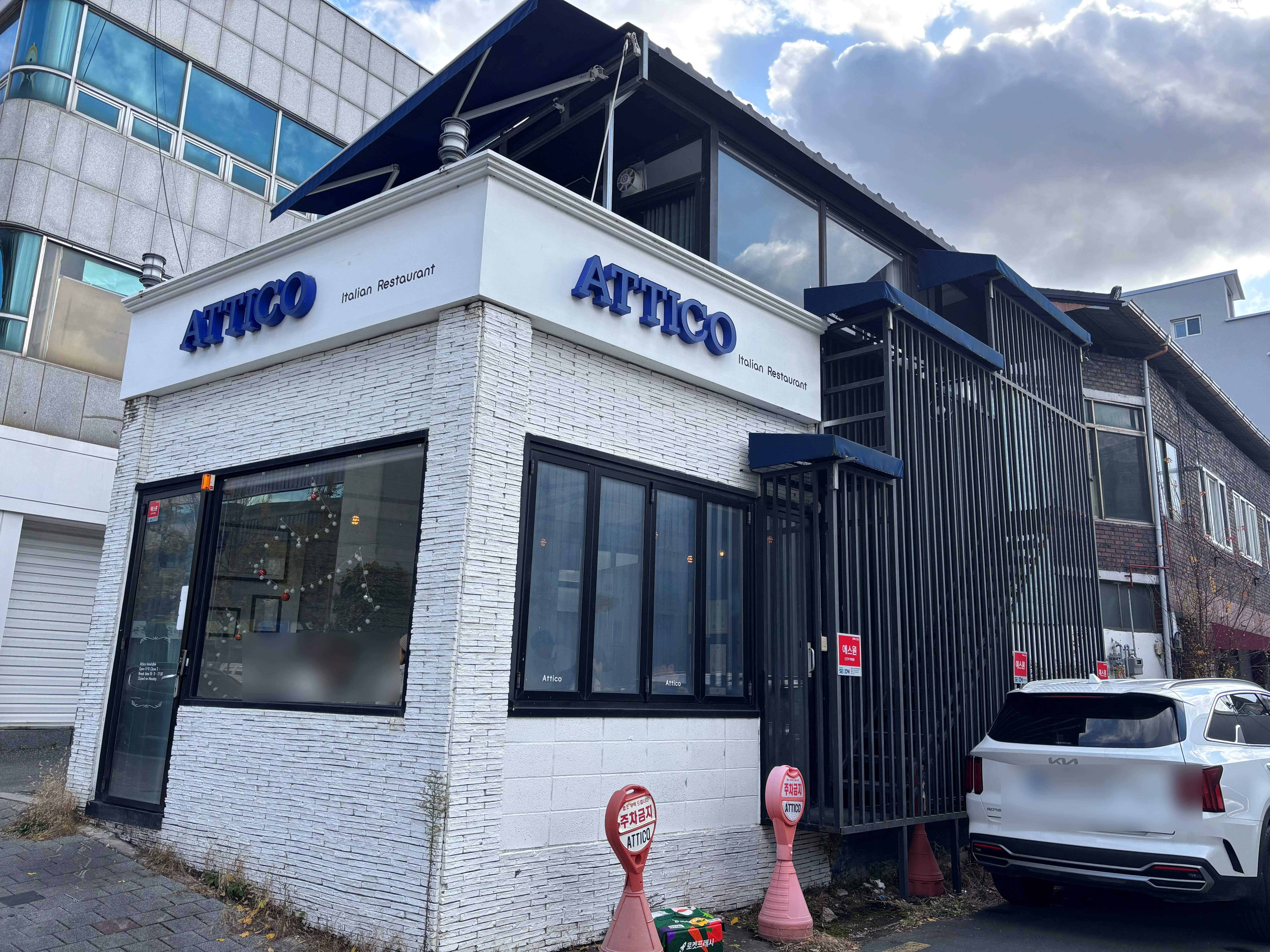 아티코 외부 모습입니다. 식당 옆 주차 3대 정도 가능해 보였어요. 2층이 있는 작은 건물입니다.