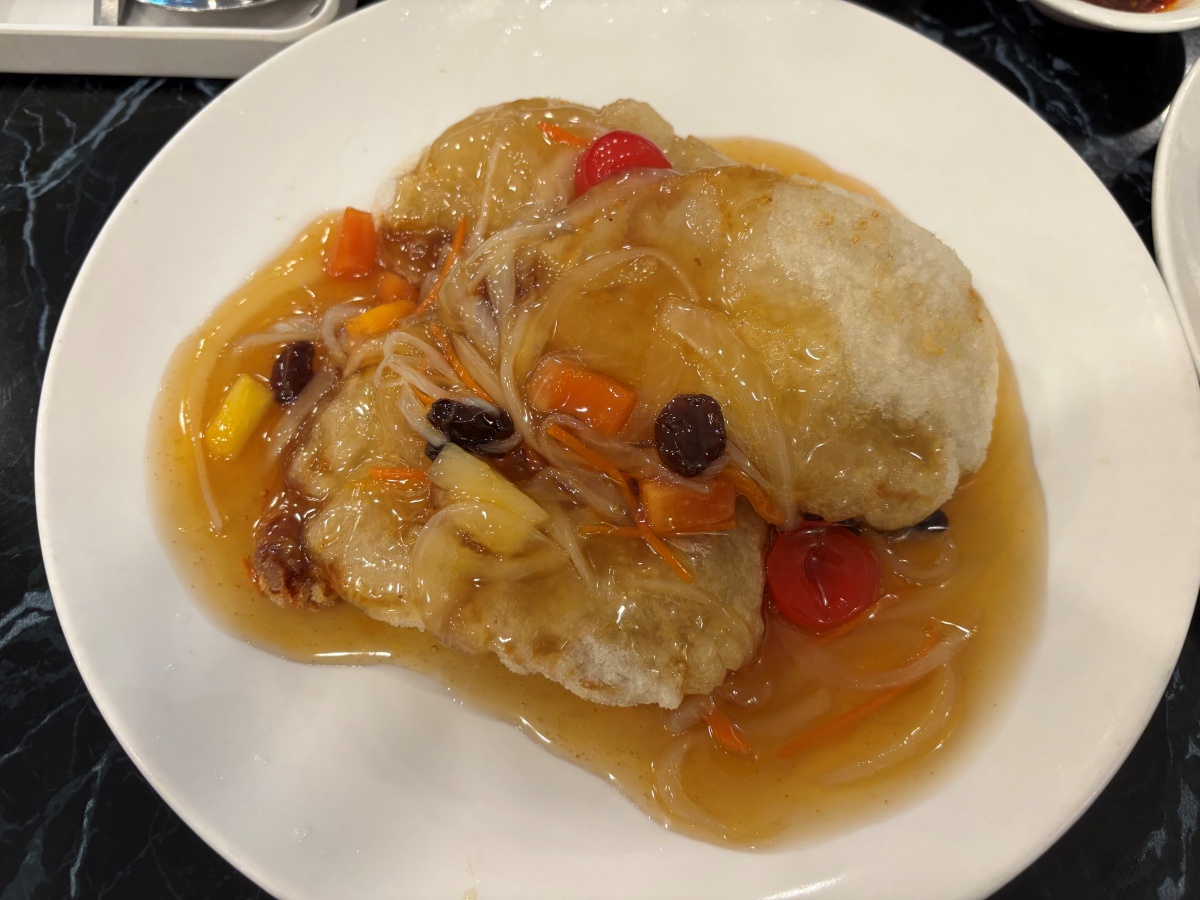 찹쌀 탕수육입니다. 소스의 야채가 후르츠칵테일을 쓰신 걸까요😆 파인애플, 체리, 건포도 등이 있네요. 돼지고기가 크게 튀겨져 나와요. 그래서인지 고기가 두껍고 씹는 맛도 좋더라고요. 새콤달콤한 소스와 함께 먹으니 더 맛있네요.