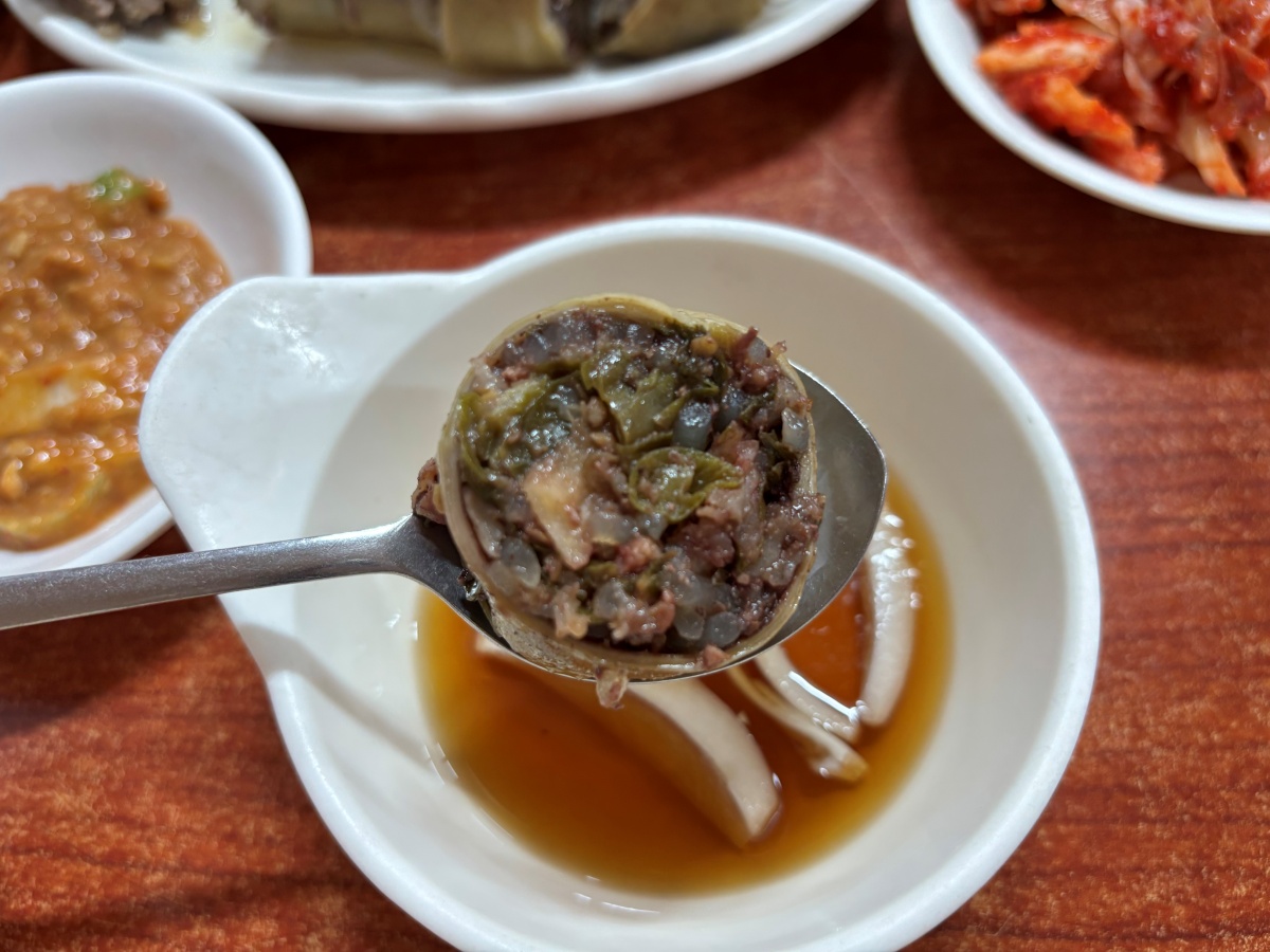 막창순대가 5-6개 정도 들어가 있었어요. 맛보기 순대도 맛있지만 국밥 안에 들어가 있어서인지 순대가 따뜻하고 더 부드럽게 느껴졌어요. 국물이 좀 더 진했으면 맛있었겠다는 아쉬움이 들었긴 했어요. 그래도 맛집은 맛집!